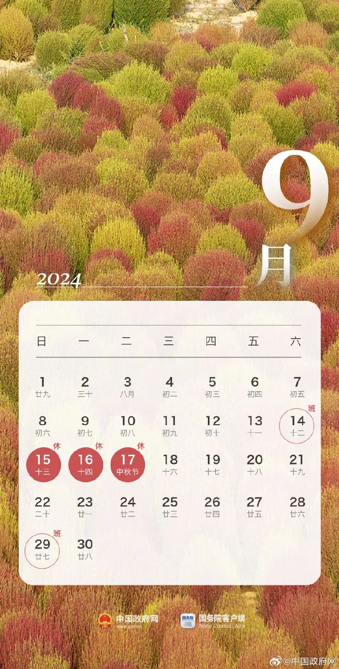 六、中秋節(jié):9月15日至17日放假調(diào)休,共3天。9月14日(星期六)上班。