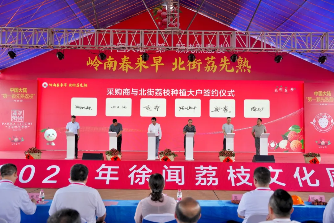 活動現(xiàn)場還為徐聞十佳荔枝種植大戶頒發(fā)了獎狀,并同步舉行采購商與北街荔枝種植大戶簽約儀式。