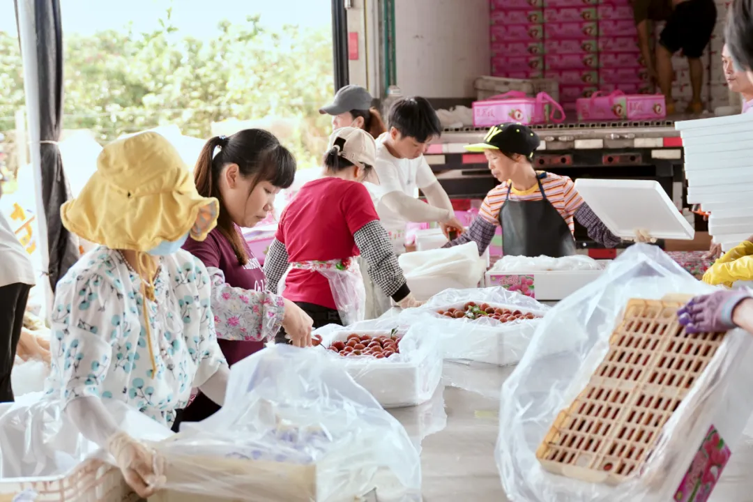 在活動現(xiàn)場,鮮紅的荔枝掛滿枝頭,農(nóng)戶果園采摘直售和冷鏈分揀、包裝、運輸同步進(jìn)行,如同一個巨大鮮荔博物館,讓游客們可以一站式感受荔枝從田頭到舌尖的蛻變,北街村的荔枝種植園化身巨大賣場,種植戶拿起手機(jī)開啟抖音直播,網(wǎng)民下單不斷。