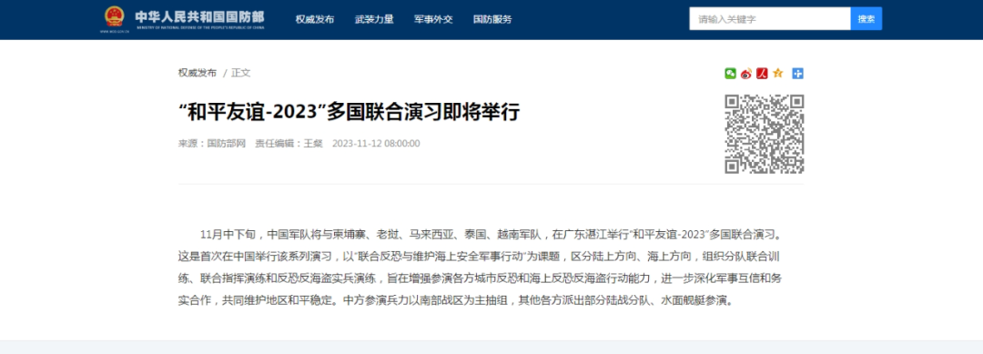 11月中下旬,中國軍隊(duì)將與柬埔寨、老撾、馬來西亞、泰國、越南軍隊(duì),在廣東湛江舉行“和平友誼-2023”多國聯(lián)合演習(xí)。這是首次在中國舉行該系列演習(xí),以“聯(lián)合反恐與維護(hù)海上安全軍事行動”為課題,區(qū)分陸上方向、海上方向,組織分隊(duì)聯(lián)合訓(xùn)練、聯(lián)合指揮演練和反恐反海盜實(shí)兵演練,旨在增強(qiáng)參演各方城市反恐和海上反恐反海盜行動能力,進(jìn)一步深化軍事互信和務(wù)實(shí)合作,共同維護(hù)地區(qū)和平穩(wěn)定。中方參演兵力以南部戰(zhàn)區(qū)為主抽組,其他各方派出部分陸戰(zhàn)分隊(duì)、水面艦艇參演。