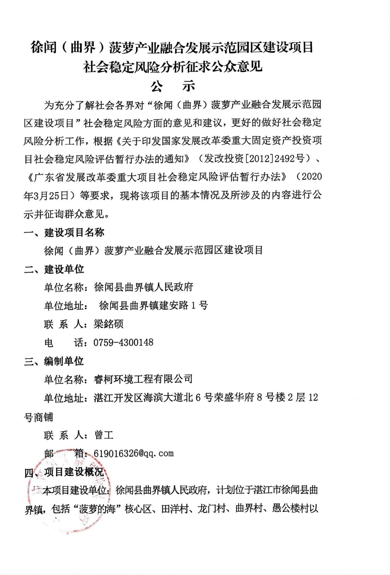 徐聞(曲界)菠蘿產(chǎn)業(yè)融合發(fā)展示范園區(qū)建設(shè)項目社會穩(wěn)定風(fēng)險分析征求公眾意見公示