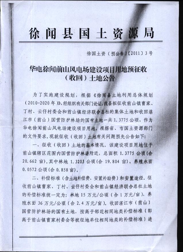 華電徐聞前山風(fēng)電場項目征地預(yù)公告