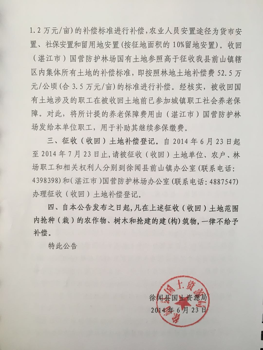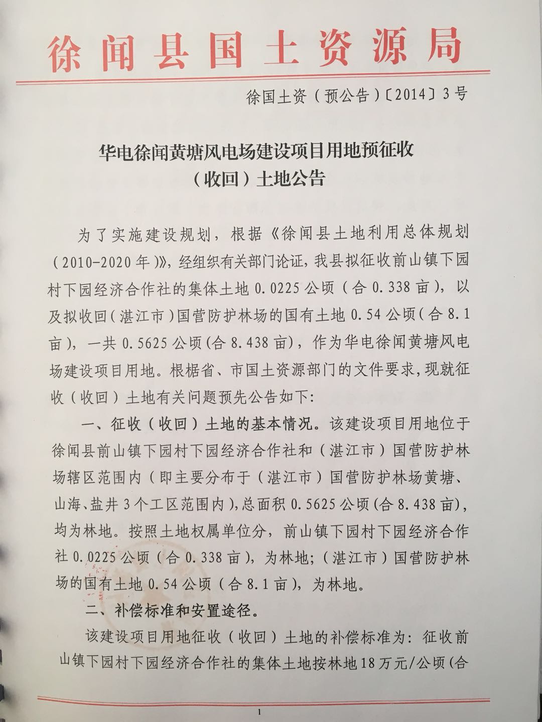 華電徐聞黃塘風(fēng)電場(chǎng)建設(shè)項(xiàng)目用地“征地預(yù)公告”.