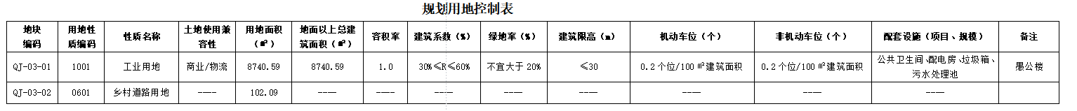 規(guī)劃控制要求及指標(biāo):工業(yè)用地(1001)面積8740.59平方米,其主要經(jīng)濟(jì)技術(shù)指標(biāo)為:容積率大于或等于1.0,30%≤建筑系數(shù)≤60%%,綠地率不宜大于20%,建筑限高30米以下;鄉(xiāng)村道路用地102.09平方米。