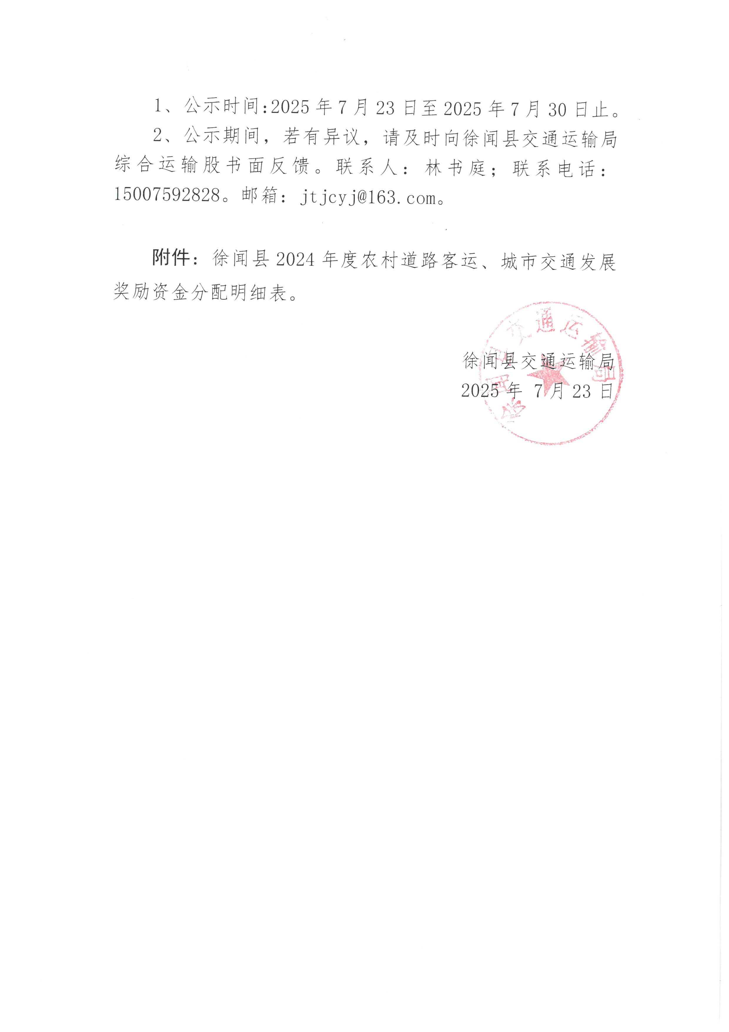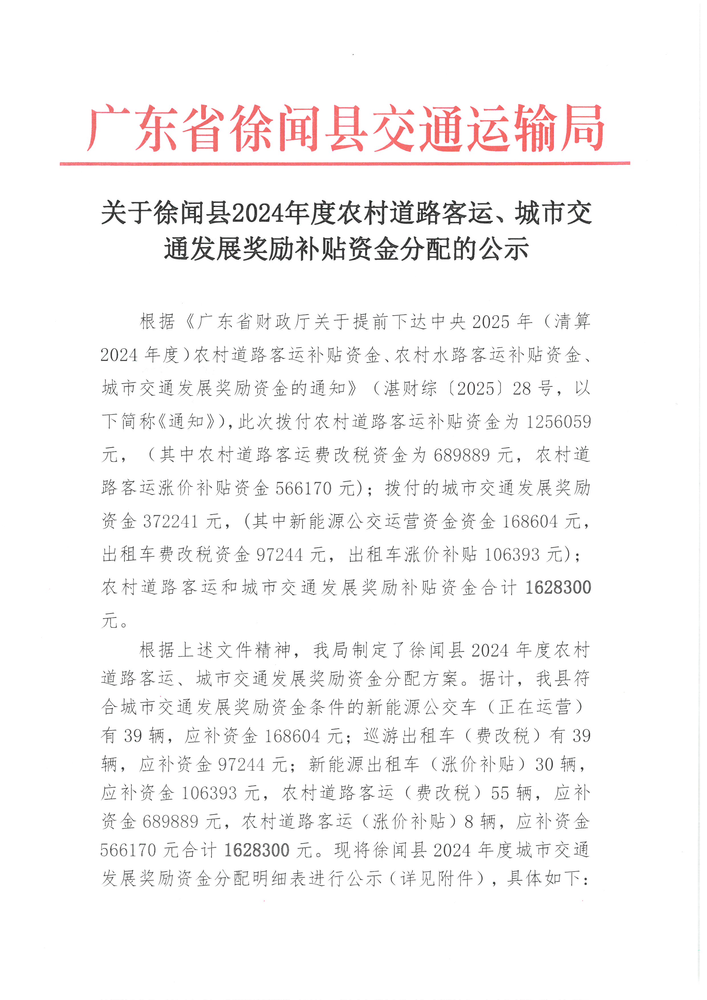 關(guān)于徐聞縣2024年度農(nóng)村道路客運(yùn)、城市交通發(fā)展獎勵補(bǔ)貼資金分配的公示