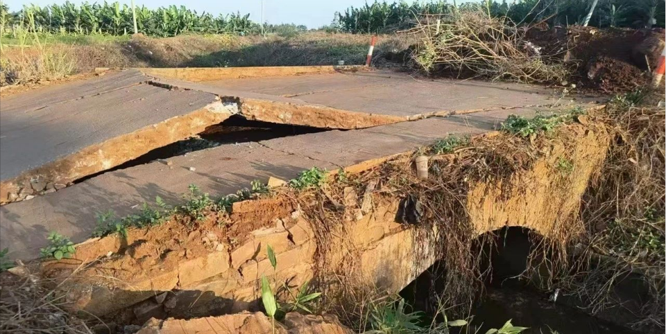土墩溝橋建于70年代,位于龍?zhí)翖钫迥蟼?cè),全長(zhǎng)20米、寬6米,不僅是連接龍?zhí)?、大塘、青安三個(gè)村委會(huì)的交通“大動(dòng)脈”,更承擔(dān)近萬名群眾日常出行及農(nóng)產(chǎn)品運(yùn)輸重任。然而,歷經(jīng)半個(gè)世紀(jì)風(fēng)雨侵蝕,加上超強(qiáng)臺(tái)風(fēng)“摩羯”的重創(chuàng),橋梁出現(xiàn)橋面貫穿性裂縫、橋墩混凝土剝落等結(jié)構(gòu)性損傷,存在重大公共安全隱患,重建迫在眉。