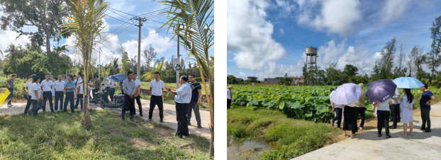 北尾村椰子樹種植基地內(nèi)——成片椰林在微風(fēng)中共舞,噴灌技術(shù)讓椰子樹個(gè)個(gè)長勢良好。在鎮(zhèn)黨委委員譚遠(yuǎn)煥和鎮(zhèn)農(nóng)技專家吳育進(jìn)的講解中,黨員們了解到了椰林產(chǎn)業(yè)的宏偉圖景和椰樹管護(hù)的經(jīng)驗(yàn)知識,真切觸摸到“黨建紅”引領(lǐng)“產(chǎn)業(yè)綠”的實(shí)踐密碼。隨后,黨員們循著荷香步入北尾村蓮藕產(chǎn)業(yè)園,恰逢荷花盛放期,百畝碧葉鋪展成綠色海洋,粉白花朵點(diǎn)綴其間。黨員們穿行在觀光步道上,聽北尾村邱之能書記介紹“黨建+合作社+農(nóng)戶”的產(chǎn)業(yè)模式:通過黨支部領(lǐng)辦合作社,改良種植技術(shù)、打造本土蓮藕品牌,不僅讓昔日荒灘變身“網(wǎng)紅打卡地”,更能帶動(dòng)周邊村民群眾就業(yè)創(chuàng)收。