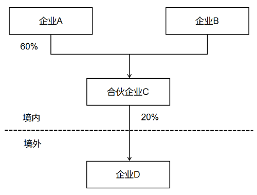 二是居民企業(yè)通過境內(nèi)合伙企業(yè),符合信息報(bào)告條件的,需由合伙企業(yè)合伙人作為報(bào)告人填寫《報(bào)告表》。示例2投資架構(gòu)如下,居民企業(yè)A和居民企業(yè)B通過境內(nèi)合伙企業(yè)C持有外國企業(yè)D股份。按照合伙協(xié)議,各合伙人按照出資比例享有合伙企業(yè)份額,居民企業(yè)A享有合伙企業(yè)C 60%的財(cái)產(chǎn)份額和利潤分配比例,合伙企業(yè)C持有外國企業(yè)D 20%股份,居民企業(yè)A視同持有外國企業(yè)D股份為60%×20%=12%,符合本公告規(guī)定條件,居民企業(yè)A應(yīng)作為報(bào)告人填寫《報(bào)告表》,境內(nèi)合伙企業(yè)C無需填寫《報(bào)告表》。