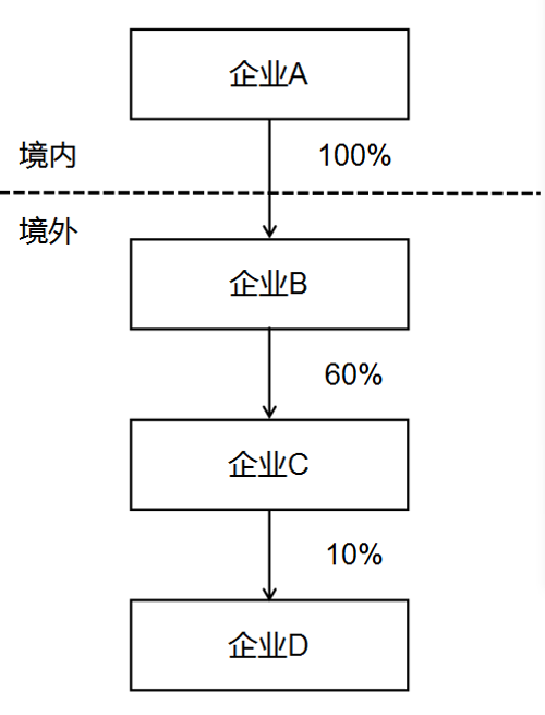 一是居民企業(yè)在一個(gè)納稅年度中的任何一天,直接或間接持有外國企業(yè)股份或有表決權(quán)股份達(dá)到10%(含)以上的,需由直接境外投資的居民企業(yè)履行填報(bào)義務(wù)。示例1投資架構(gòu)如下,居民企業(yè)C直接持有外國企業(yè)D股份,符合本公告規(guī)定條件,應(yīng)作為報(bào)告人填寫《報(bào)告表》,居民企業(yè)A和居民企業(yè)B未直接持有外國企業(yè)股份,無需填寫《報(bào)告表》。