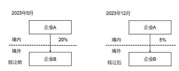 二是若一個(gè)納稅年度中間發(fā)生股權(quán)轉(zhuǎn)讓,導(dǎo)致年末持股比例不足10%的,仍需報(bào)告被轉(zhuǎn)讓境外被投資企業(yè),報(bào)告人在填報(bào)“外國企業(yè)生產(chǎn)經(jīng)營信息”時(shí),可以填報(bào)轉(zhuǎn)讓前最近一期的數(shù)據(jù)。示例4投資架構(gòu)如下,居民企業(yè)A在2023年5月取得外國企業(yè)B股份為20%,并于2023年8月轉(zhuǎn)讓15%的股份,2023年末持有外國企業(yè)B股份為5%,居民企業(yè)A在2023年度持有外國企業(yè)B的股份超過10%,符合本公告規(guī)定條件,居民企業(yè)A應(yīng)就外國企業(yè)B填報(bào)《報(bào)告表》,其中第10欄“報(bào)告人持股比例(年末數(shù))”“直接持股”應(yīng)填寫5%。